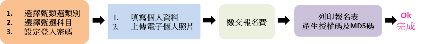 2. 線上報名系統於考生報名完成後,會核發給每位考生一組「授權碼」及「MD5查核碼」(會列印於報名表上供現場報名查詢、檢核之用)